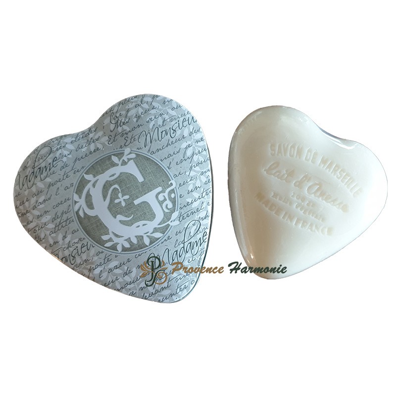 Esta caja metálica en forma de corazón presenta un fondo manuscrito de estilo poético y un medallón central con la letra G. En su interior contiene un jabón en forma de corazón, delicadamente perfumado, enriquecido con leche de burra y manteca de karité, elaborado en la Provenza. Es un regalo ideal para personas cuyo nombre empieza por G o para quienes valoran los objetos decorativos y personalizados. Una vez utilizado el jabón, la caja se convierte en un bonito estuche para joyas o recuerdos.